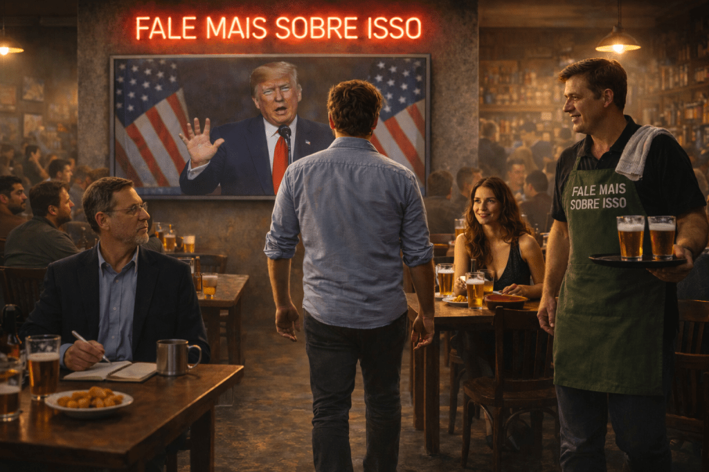 O bar inteiro zumbia ao fundo — alguém xingando o STF, outro falando da anistia pros golpistas, um estudante berrando contra o fascismo trumpista. O Doutor observava tudo, silencioso, anotando.